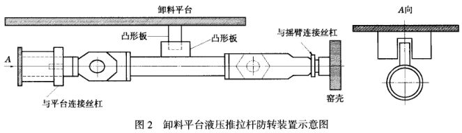 增加防止丝杠转动装置(图2),即在推拉杆与平台连接处增加锁紧圆螺母,在平台底面焊接凹形板,在推拉杆上焊接凸形板。使两种特型板嵌套在一起。这样在平台动作时,推拉杆的凸形板在凹形板内滑动,消除了内应力对丝杠的影响,从而从根本上解决了退扣问题。