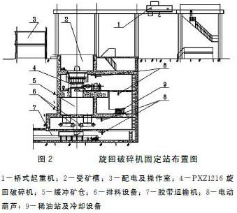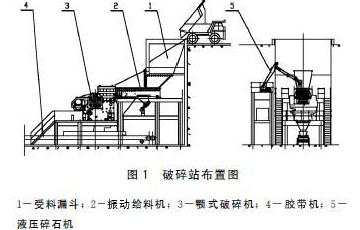 国内以旋回破碎机作为主机的破碎站大都是固定破碎站,国外同类产品中虽有相近能力的半移动破碎站,因为价格或者其他因素,在国内应用较少。所以以固定式破碎站作为比较对象,其配置如图2。