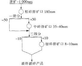 因为厂房、吊车、地点等限制,中、细碎的设备配置,尤其细碎设备的配置存在明显的问题。该厂中、细碎设备配置与相近的有色金属选矿厂比较,机型处理能力小,尤其细碎设备破碎处理能力极为薄弱,造成碎矿设备开机时间长,设备磨损快,事故多,碎矿产品粒度难以保证。