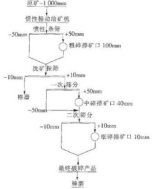 增加1台1500mm×3500mm双层重型振筛和1台1500mm螺旋分级机。经粗碎的原矿,由皮带进入洗矿振筛,振筛为双层筛面,上层筛面孔径15mm,在水力冲洗及振动下,+15mm矿石及泥浆漏入下层筛面;下层筛面筛孔直径6mm,+6mm矿石沿下层筛面滚入皮带机;-6mm矿石及泥浆漏下筛孔沿沟槽流入Φ1500mm单螺旋分级机,泥浆由单螺旋分级机溢流进入4/3沃曼砂泵,由砂泵送入浮选流程。+2mm矿石由单螺旋分级机返回皮带机。